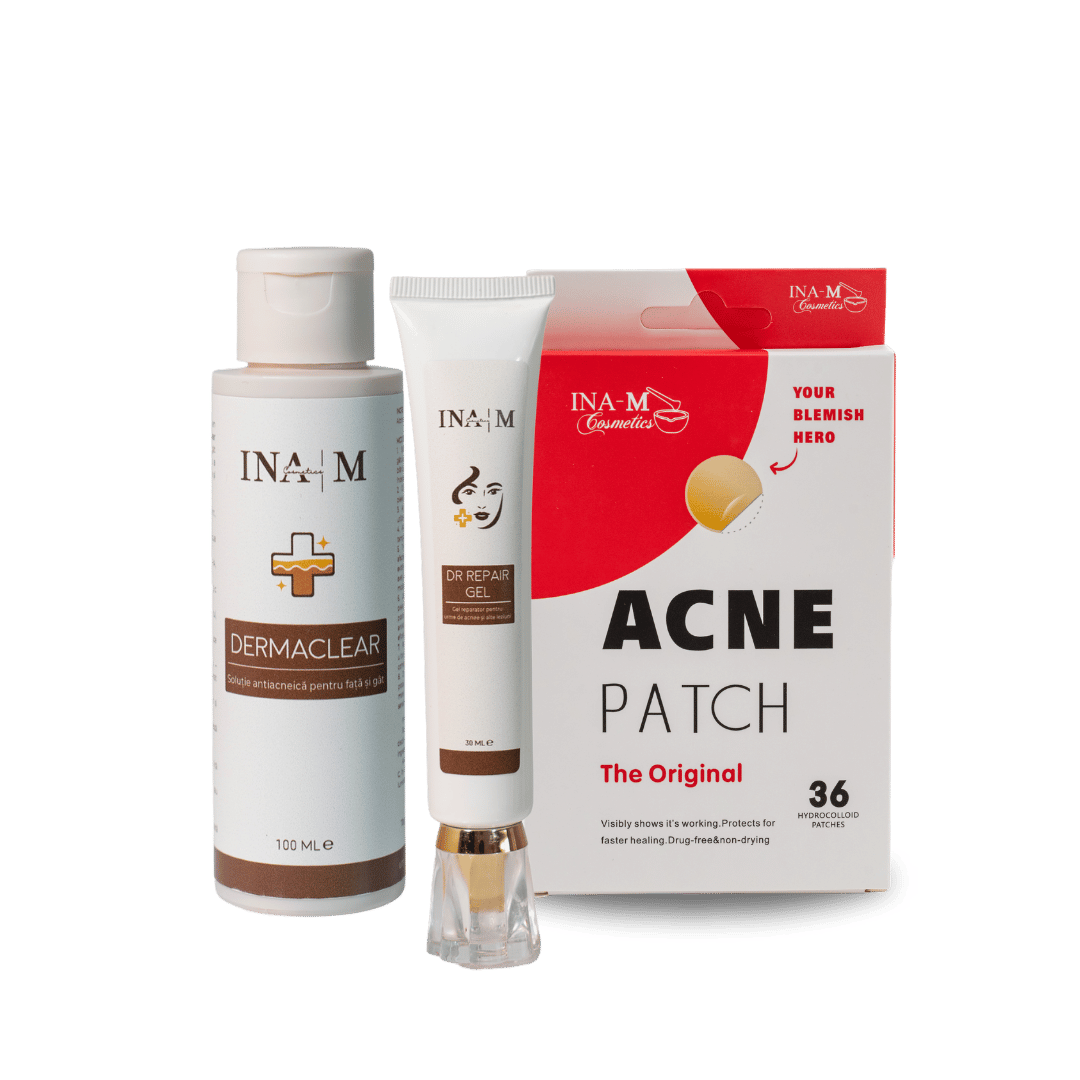 Pachetul conține : Soluție Antiacneică pentru față și gât Dermaclear 100 ml – INA M Cosmetics; Dr. Repair Cream, Complete Restore Gel 30 g – INA M Cosmetics și Tratament Eficace Anti- Acnee, Pete și Imperfecțiuni, ACNE OUT PATCH x 36 plasturi – INA M Cosmetics.