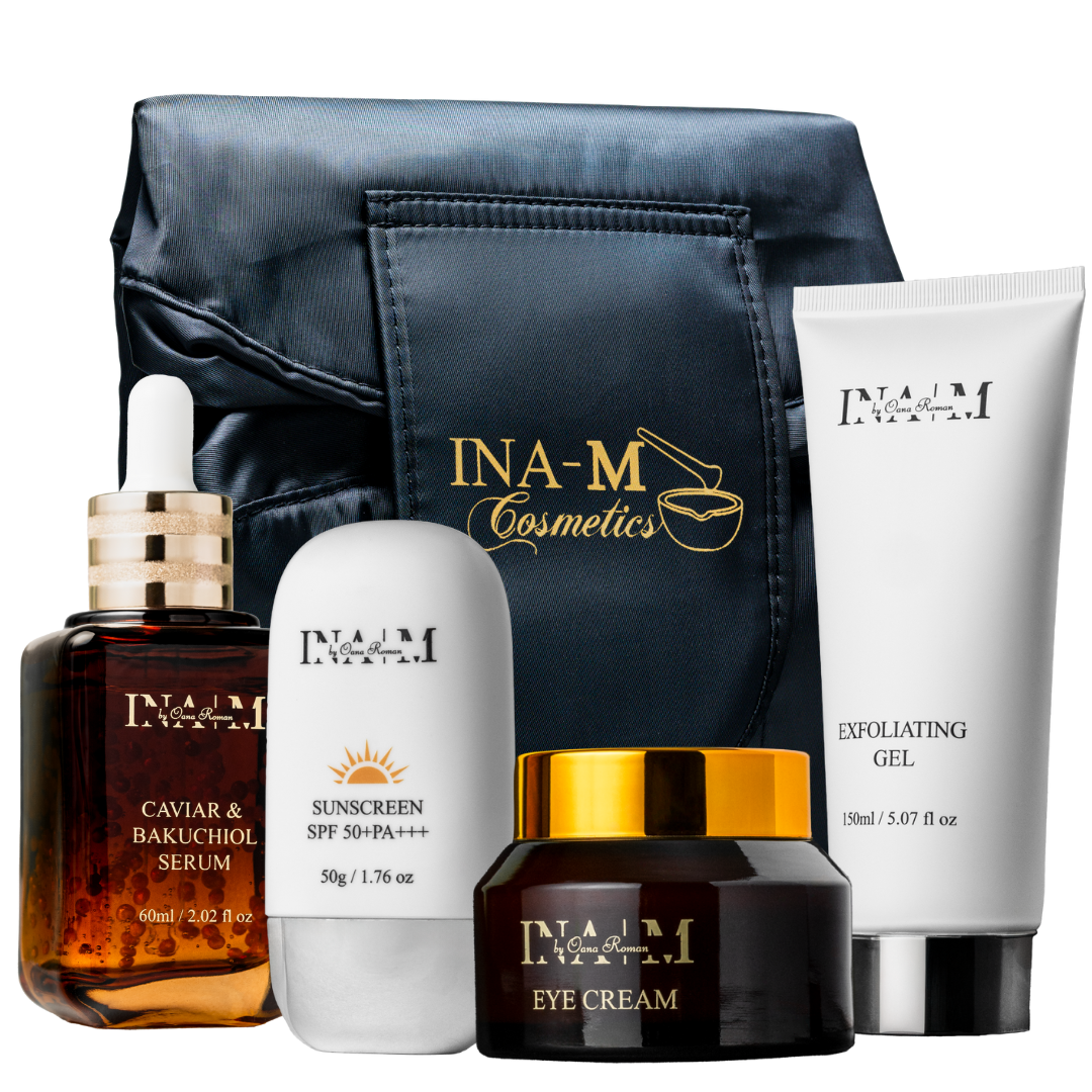 Setul conține: Bakuchiol & Caviar Serum 60 ml – INA M by Oana Roman, Eye cream 30 g – INA M by Oana Roman, Exfoliating Gel 150 ml – INA M by Oana Roman, Sunscreen SPF 50 + PA +++ 50 g, Geantă pentru cosmetice CADOU