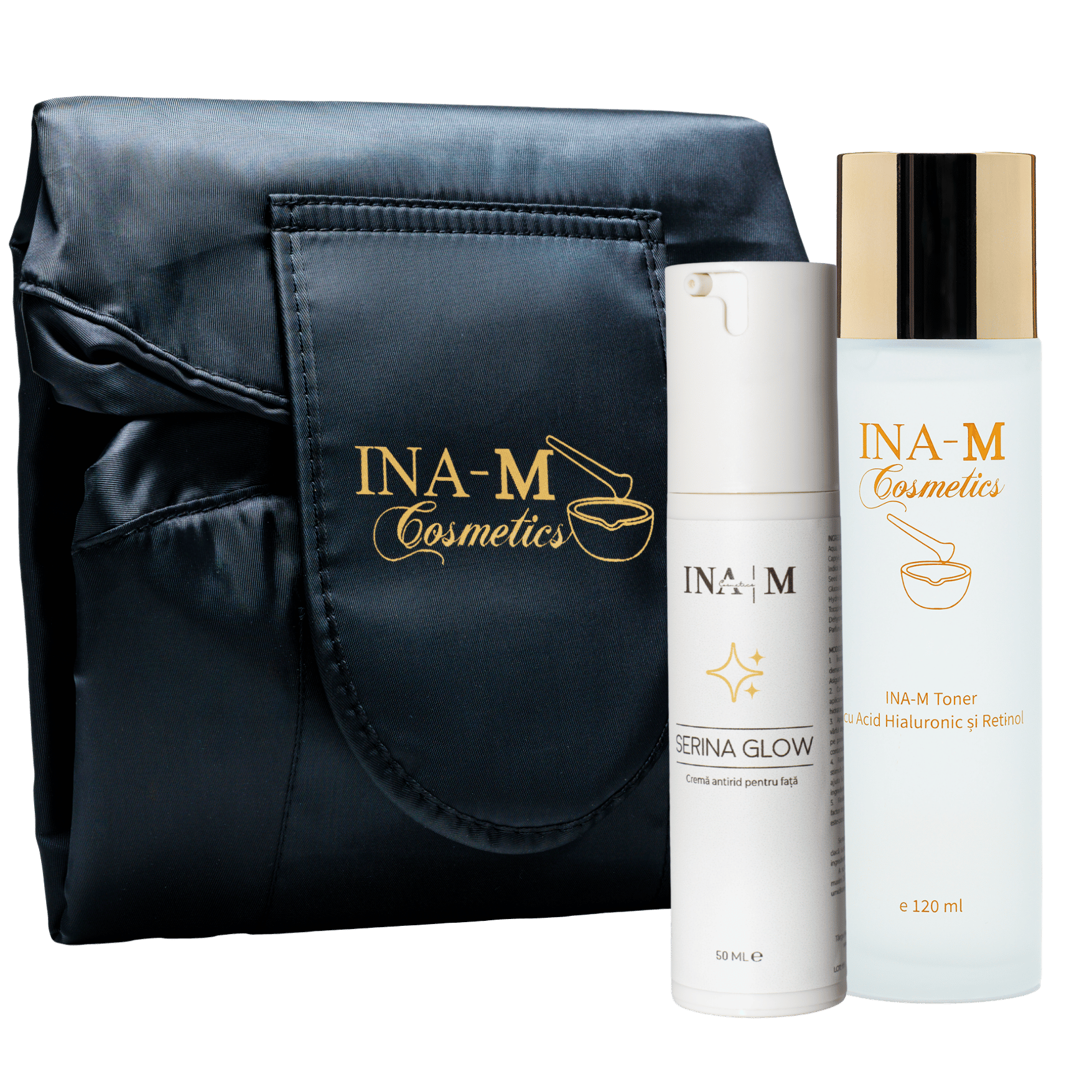 Setul conține: Toner cu Acid Hialuronic și Retinol 120 ml, Divine Glow – INA M Cosmetics, Cremă antirid iluminatoare cu Acid Hiaulornic Dual SERINA GLOW – INA M Cosmetics, Geantă pentru cosmetice CADOU